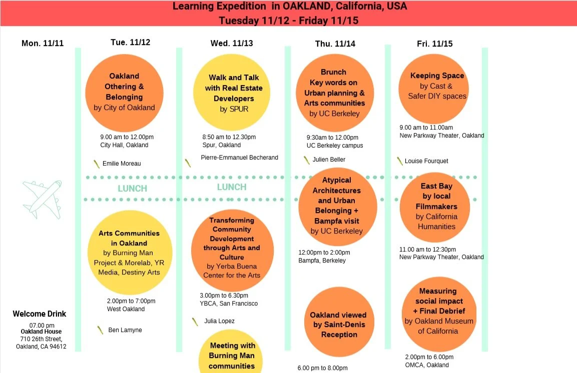 Californian partners (some of them took part in the previous learning expedition in Saint-Denis) : the Community Arts Stabilization Trust (CAST), the non-profit organization California Humanities, the City of Oakland, the department Arts + Design of UC Berkeley, the urban agency SPUR, the studio Morelab, Burning Man Project, the Oakland Museum of California (OMCA), Youth Radio Media, Shade Tree, Safe DYI and Destiny Arts Center.